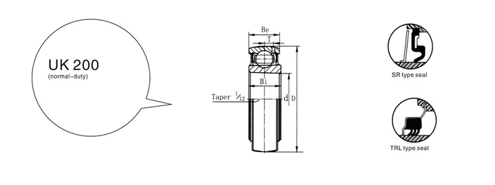 UK200 series outer spherical ball bearing has a taper inner hole with an internal diameter of 1:12, which can be directly installed on a tapered shaft or used with a fixed sleeve, and can fine-tune the bearing clearance. The characteristics of this type of outer spherical ball bearing are: it can accept more load than the outer spherical ball bearing with a jackscrew of the same internal diameter, has a very high bearing capacity, a small radial section, can save space, but the speed is relatively low. Reduce the consumption of force and play the role of safety protection. Tight sleeve outer spherical bearing is applicable to machinery with vibration and impact load and the connection part of two shafts. It has higher speed and bearing capacity than UC and HC bearings with the same inner diameter size when it requires higher vibration and rotation accuracy.