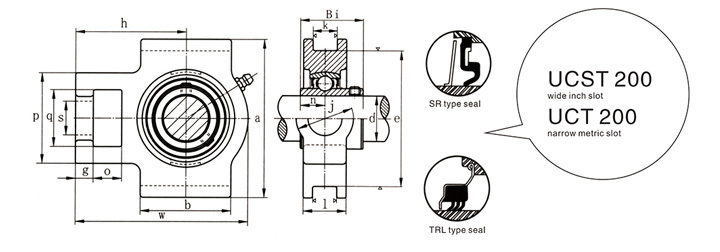 The outer spherical bearing UCT with sliding block seat is a bearing assembly composed of a bearing and a bearing seat with guide rail groove. Bearing pedestal T can be combined with UK, UEL and other components. There are two chutes at the top and bottom of the bearing pedestal, which can move back and forth on the frame. Therefore, it is most suitable for the occasion where the distance between shafts needs to be adjusted. The shaft can also move when the machine is running. UCT300 series bears more load than UCT200 series. This kind of spherical ball bearing with seat is mostly used on transmission shafts such as belts and chains.